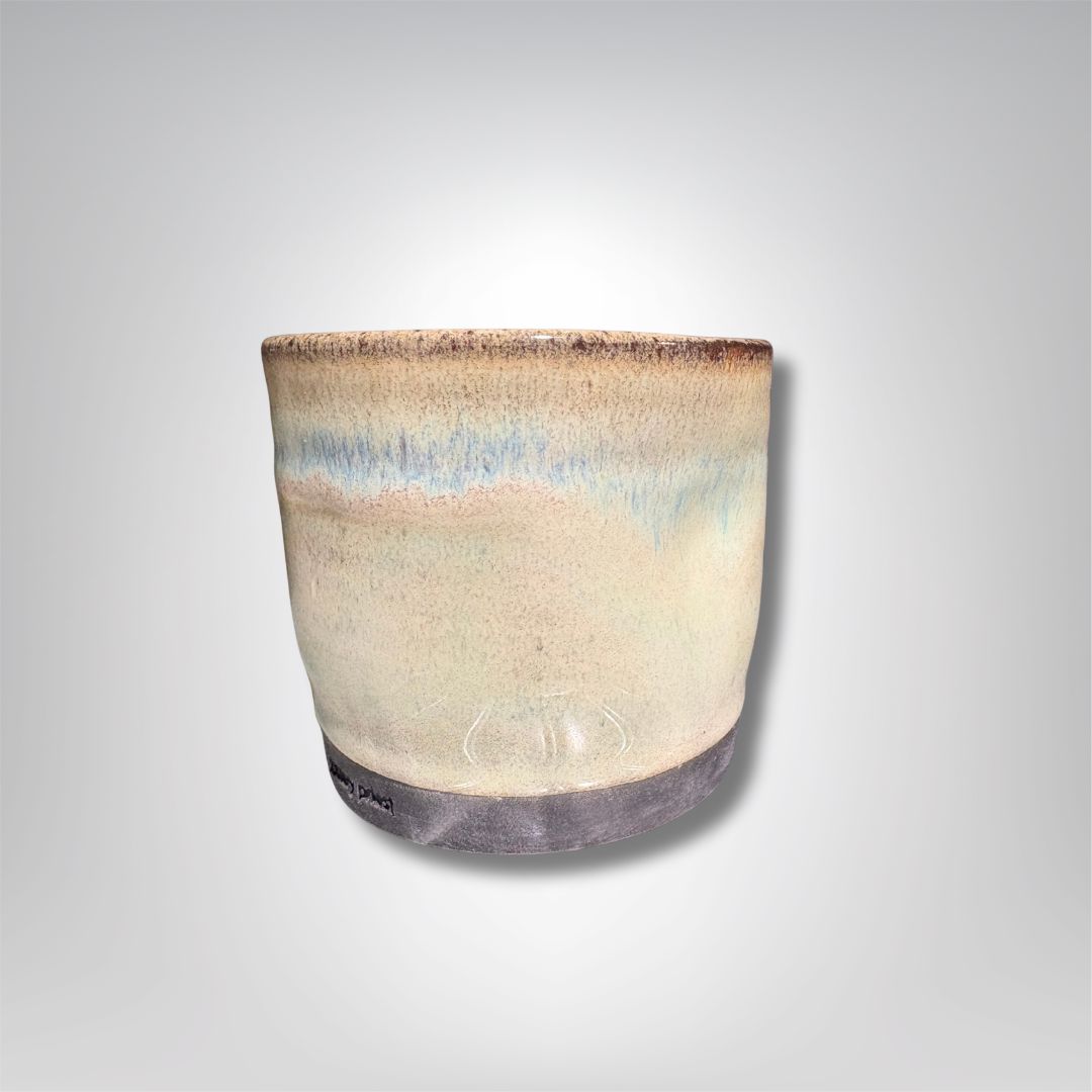 Autoriaus Povilo Reigio kūrybos juodojo molio rankų darbo puodelis, švelnios mėlynos spalvos.
