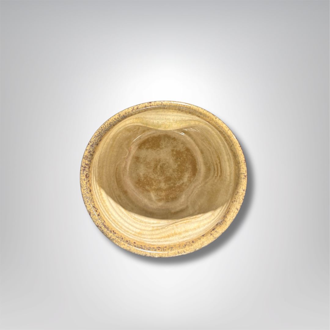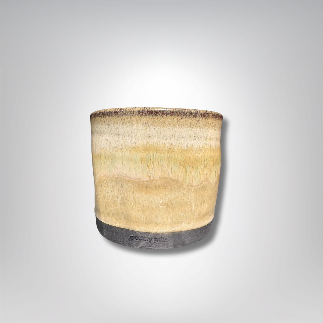 Autoriaus Povilo Reigio kūrybos juodojo molio rankų darbo puodelis, subtilios smėlio spalva.