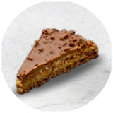Traškus, sviestinis pagrindas ir karamelė su migdolo riešutais.