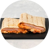 Šildoma tortilija su kumpiu, sūriu, pievagrybiais ir pikantišku padažu.