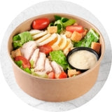 Klasikinės salotos su padažu, sultinga kepta vištiena bei traškiais skrebučiais.