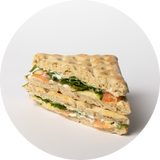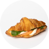 Sviestinis kruasanas, naminis pesto, mocarelos sūris, pomidorai, špinatai.