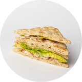 Poliarinė duonelė, Cezario salotų padažas, vištiena, gruzdinta šoninė, kietasis sūris, salotos.