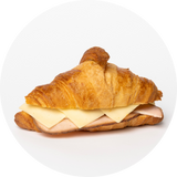 Sviestinis kruasanas, čederio sūrio padažas, kiaulienos kumpis, sūris "Gauda”.