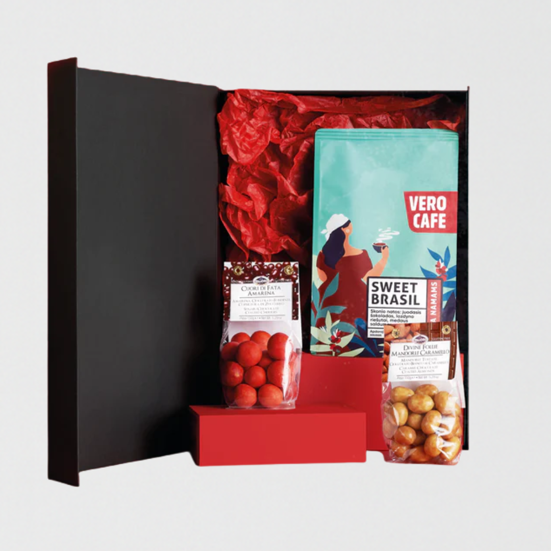 Stilingai supakuoti dovanų rinkiniai, kuriuose mūsų kavos namuose skrudinta kava ir įvairūs kaviški priedai. Beliks tik padovanoti!