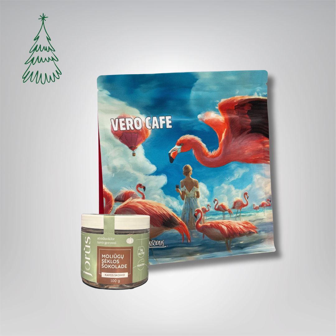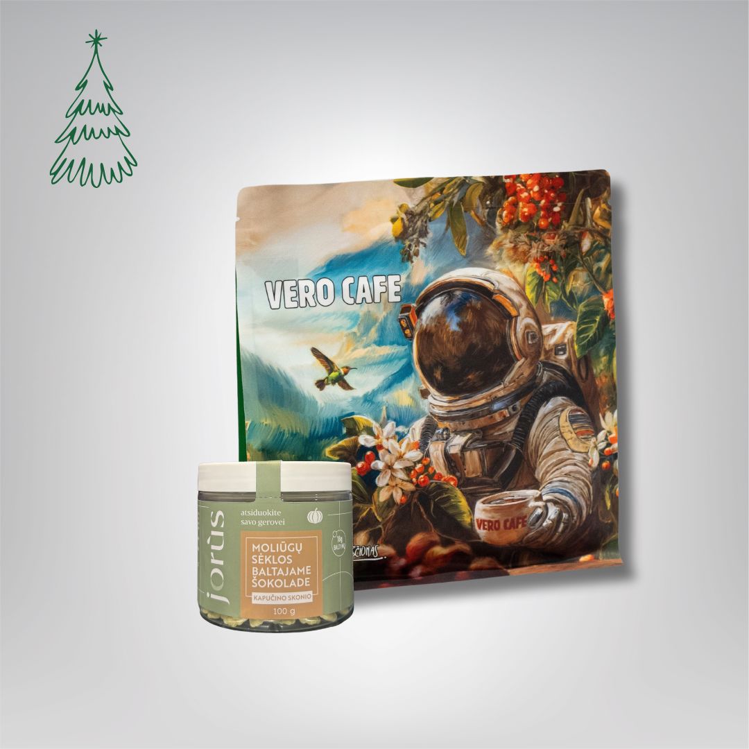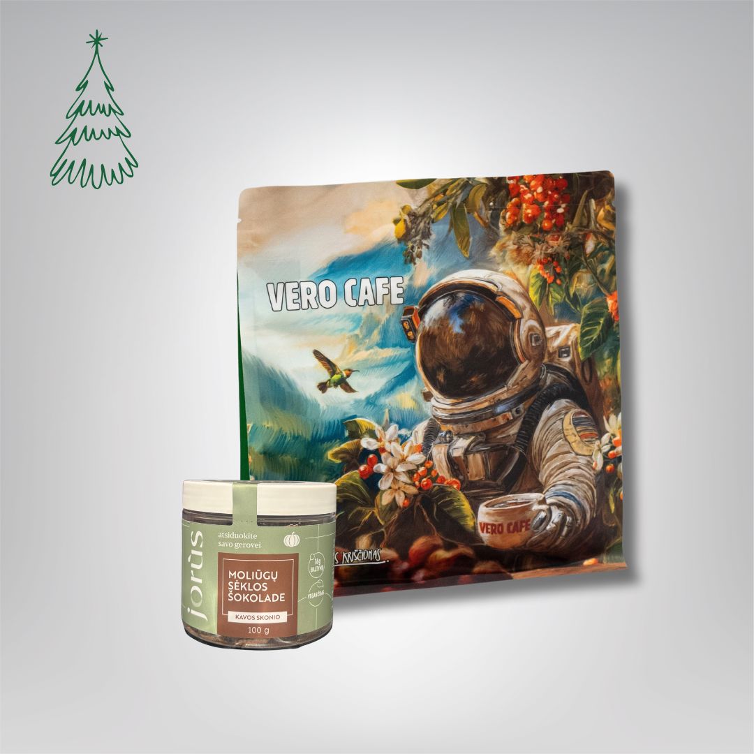 Pasirinkite šį dovanų rinkinį ir suteikite artimiesiems nepakartojamą akimirką – mėgaujantis mėgstamo skonio kava ir lietuviško prekės ženklo moliūgų sėklomis šokolade.